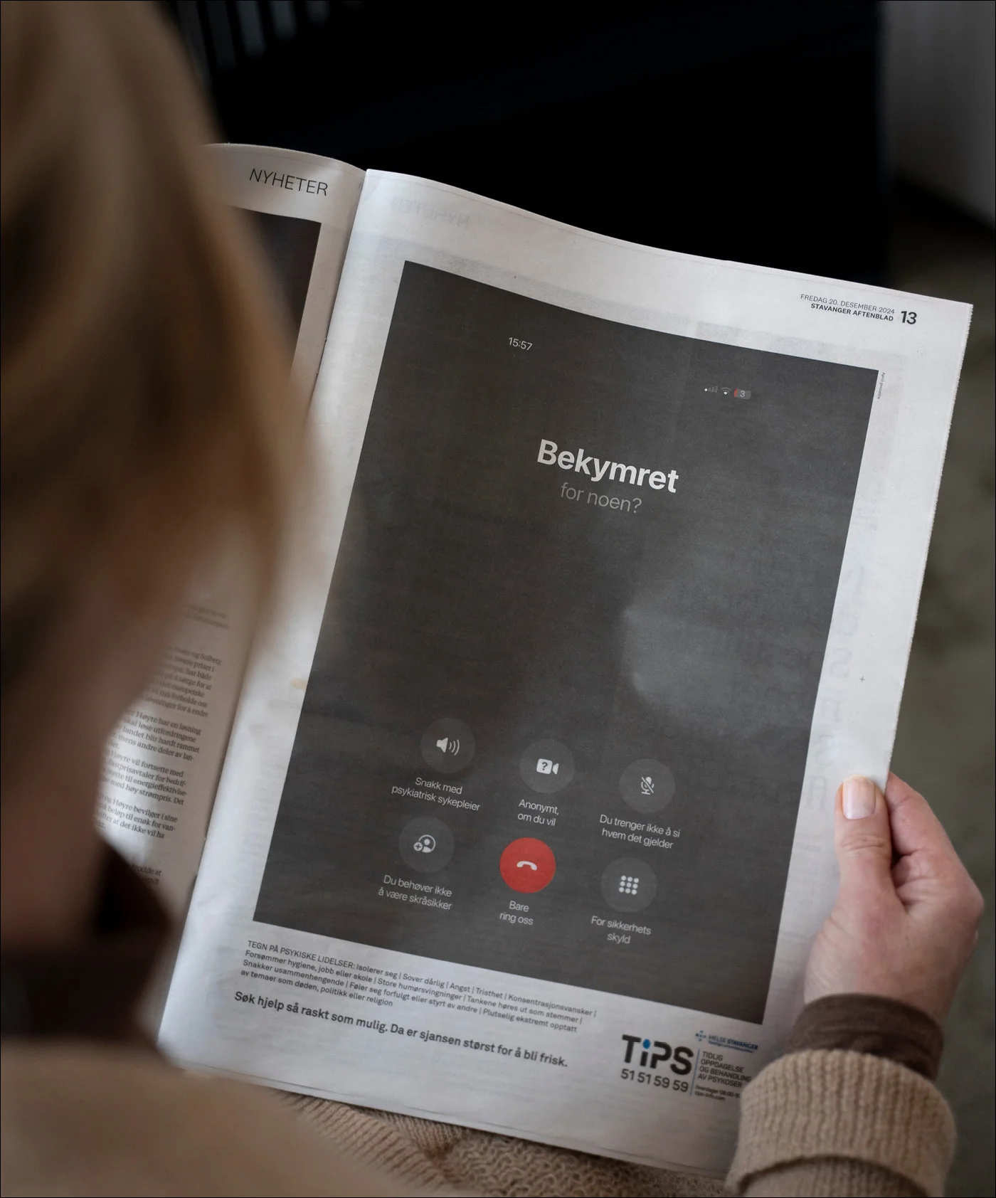 Derfor finnes TIPS-telefonen: Et lavterskeltilbud for deg som er bekymret for egen eller andres psykiske helse. Et sted å spørre, lufte bekymringer – uten å overtenke, uten å være redd for å si noe som ikke stemmer, uten å være bombesikker på at det du er redd for, er virkelig. Den vurderingen kan du trygt overlate til sykepleieren i andre enden. Du kan til og med være anonym, om du vil. Det er mye viktigere at du ringer. Og at du ringer litt kjapt. For jo raskere den du er bekymret for, får hjelp, jo større er sjansen for å bli frisk.